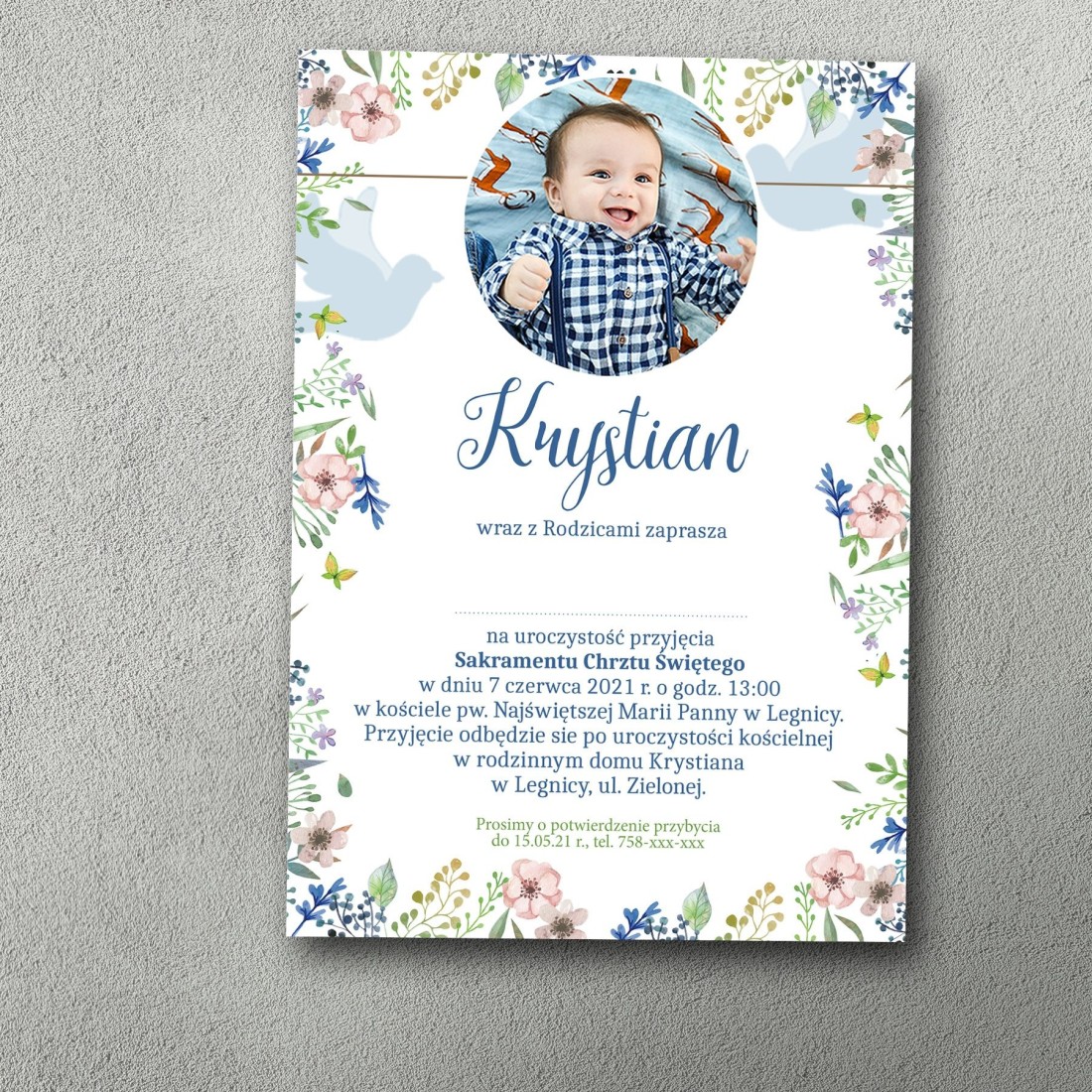 Zdjęcie dziecka umieszczone w okrągłej ramce przywołuje miłe chwile i wspomnienia. Kwiaty wypełniają brzegi zaproszenia a w tle delikatny, błękitny gołąbek.