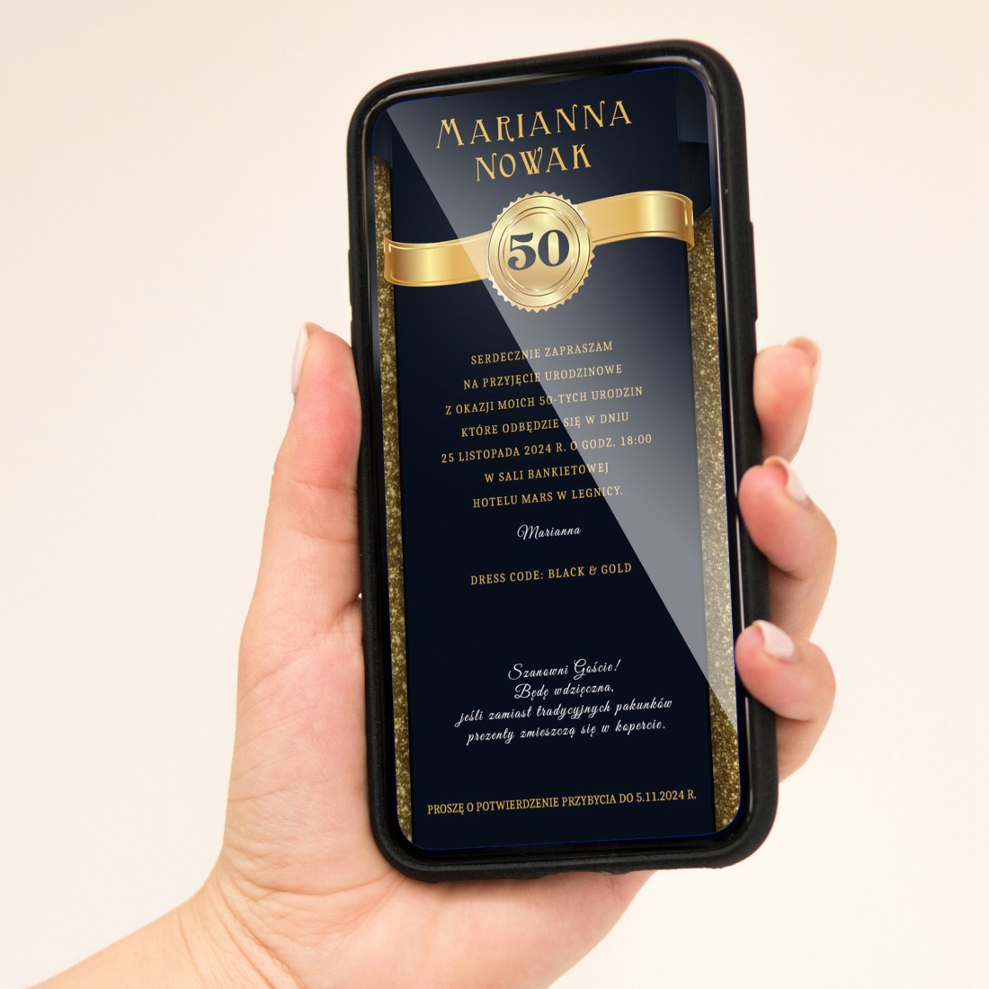Stylowe zaproszenie elektroniczne ze złotą wstęgą, przeznaczone dla osób poszukujących eleganckiej i nowoczesnej formy zaproszenia gości.