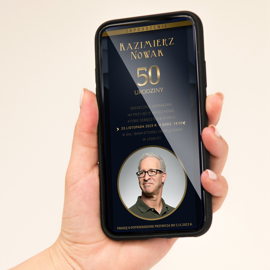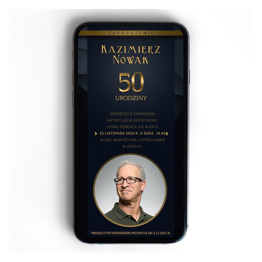 Zaproszenie elektroniczne ze zdjęciem wyróżnia się dopracowaną grafiką oraz czytelnym układem treści. Zdjęcie Solenizanta w kole zostało umieszczone na dole, nadaje zaproszeniu wyjątkowego charakteru i sprawia, że doskonale sprawdzi się przy urodzinach o formalnym charakterze.