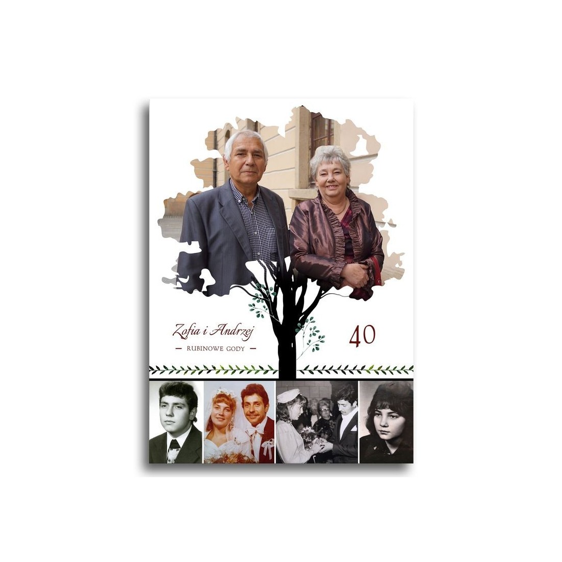 Zatrzymaj najważniejsze chwile wspólnego życia w formie wzruszającego fotobrazu w kształcie drzewa – symbolu domu, trwałości i głębokich korzeni miłości. Główne, współczesne zdjęcie pary umieszczone jest w koronie drzewa, symbolizując rozkwit i dojrzałość związku. Poniżej – zdjęcia z przeszłości, młodości i ślubu, tworzące fundamenty drzewa, jak korzenie zakorzenione w ziemi i wspomnieniach.