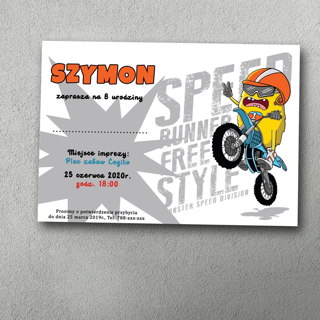 Na zaproszeniu "MotoStworek" wesoły żółty stworek w kasku i okularach jedzie na motorze, który staje dęba. Pokazuje znak „Peace”, a w tle widać dużą, szarą gwiazdę i napis „Speed Runner Free Style”. Grafika emanuje energią, ruchem i dziecięcą radością.
