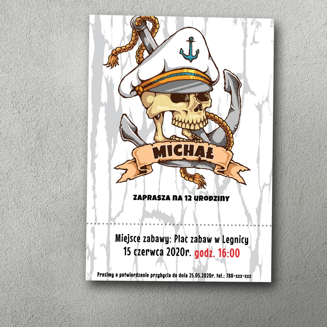 Dominującym elementem zaproszenia "Kapitan Czacha" jest duża, efektowna czaszka w czapce marynarza, która przyciąga wzrok już od pierwszego spojrzenia. Towarzyszy jej kotwica – symbol morskiej przygody i żeglarskiego ducha. Grafika utrzymana jest w wyrazistym, morskim stylu, łącząc odrobinę grozy z marynistycznym klimatem. Idealna dla chłopca z charakterem – fana morza, statków, piratów lub klimatów rockowo-przygodowych.