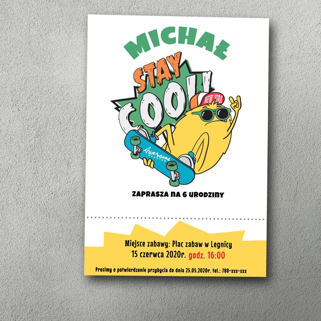 Zaproszenie urodzinowe "Stay Cool" aż kipi luzem, zabawą i dziecięcym stylem. Idealne dla chłopca kochającego deskorolkę, lato i beztroskę. Żółty stworek w czapeczce z daszkiem i stylowych okularach jedzie na deskorolce, promieniując pozytywną energią. Nad nim widnieje napis „Stay Cool”, a u dołu kompozycję uzupełnia żółta fala, dodająca wakacyjnego, surferskiego klimatu.