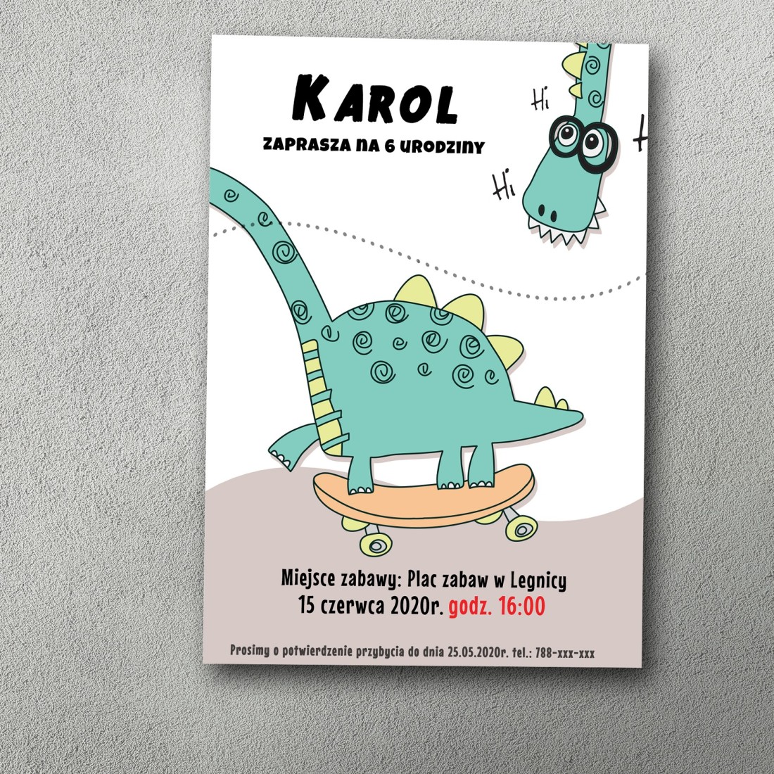 Rozkręć dinozaurową imprezę z naszym zaproszeniem Dino Frajda! Uroczy dinozaur na deskorolce, który ledwo mieści się na kartce i z humorem spogląda na siebie z góry w zabawnych okularkach, z pewnością rozbawi każdego małego gościa. Idealne na urodziny dla dzieci kochających dinozaury, śmieszne rysunki i dużą dawkę ruchu. Zaproszenie łączy bajkowy klimat z energią dziecięcej zabawy!