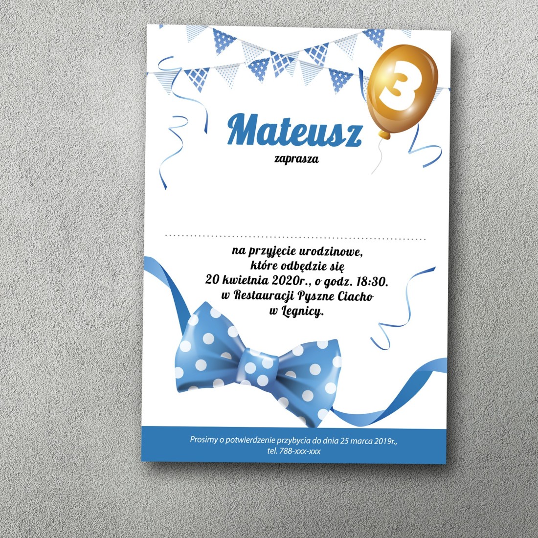 Miejsce na: imię dziecka, datę, godzinę, miejsce przyjęcia, telefon do potwierdzenia