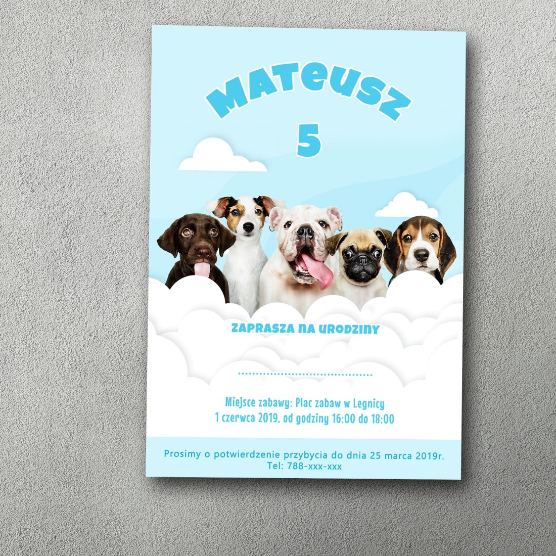 Zaproszenie Psia Ekipa to uroczy motyw dla małych miłośników czworonogów. Na niebieskim tle z chmurkami wyłania się grupa różnorodnych szczeniaczków, które patrzą prosto na gości, zapraszając na pełne radości urodziny. Idealne na przyjęcia pełne przyjaźni, zabawy i dziecięcej energii.