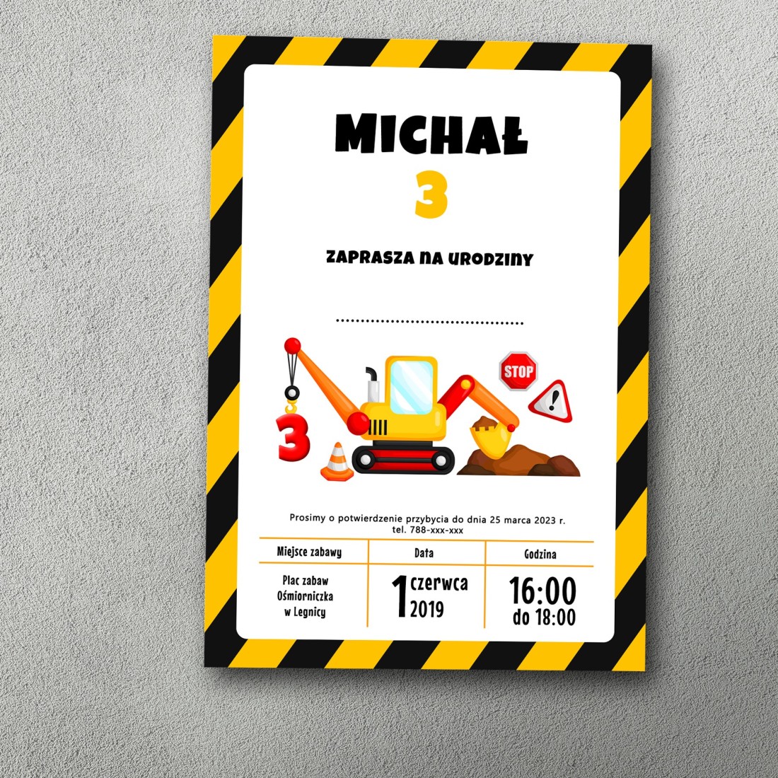 Czas rozpocząć budowę najlepszych urodzin! Zaproszenie Koparkowe Party to prawdziwa gratka dla dzieci, które kochają koparki, dźwigi i ciężki sprzęt. Na środku ilustracja koparki z wysięgnikiem, który unosi dużą cyfrę z wiekiem dziecka. Całość otacza czarno-żółta ramka ostrzegawcza – jak na prawdziwym placu budowy. Personalizacja sprawia, że każdy gość poczuje się jak część ekipy urodzinowej!