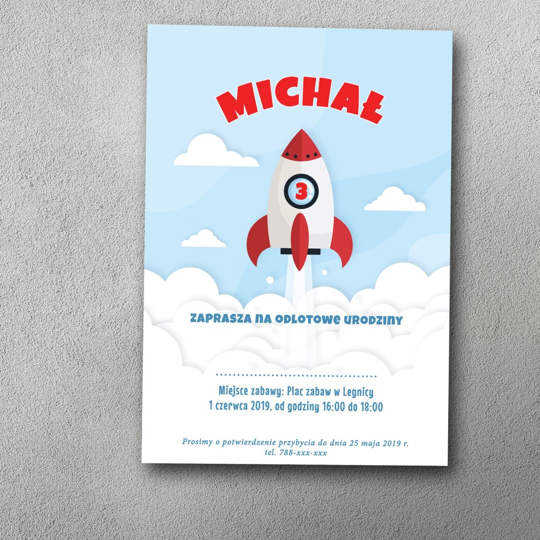 Wzbij się w kosmiczne urodziny z zaproszeniem Rakietkowe Niebo! Niebiesko-czerwona rakieta z dużą cyfrą unosi się ponad białymi chmurkami, na tle jasnego nieba. Subtelna, bajkowa kolorystyka sprawia, że to zaproszenie idealnie pasuje na urodziny małych marzycieli i odkrywców gwiazd. Personalizacja wiekiem i imieniem czyni je wyjątkowym!