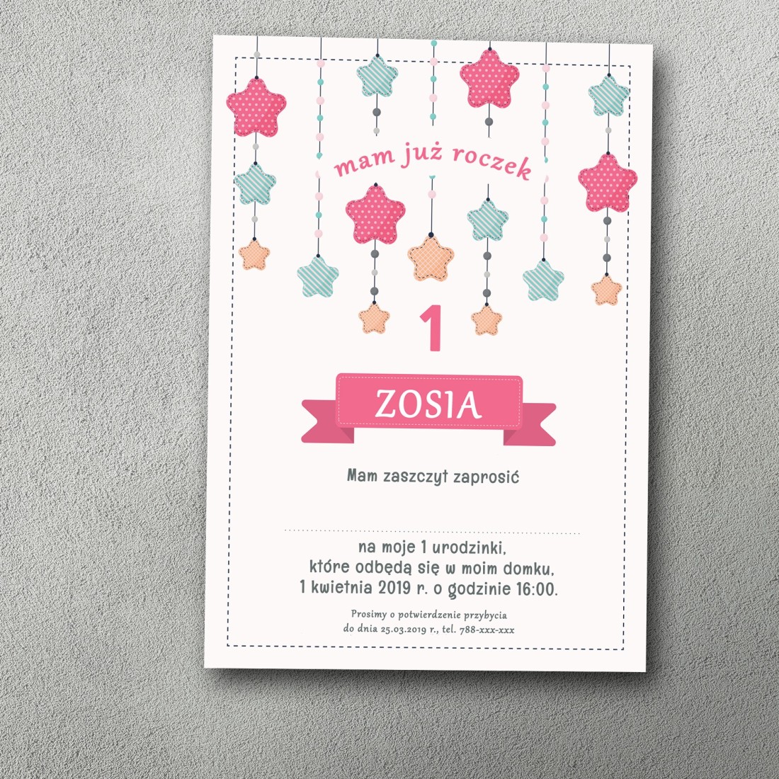 Gwiezdny Roczek to zaproszenie, które łączy dziewczęcą subtelność z odrobiną bajkowej magii. Różowe tło w połączeniu ze zwisającymi gwiazdkami w pastelowych kolorach wprowadza ciepły, dziecięcy klimat. Centralna ozdobna ramka z imieniem dziecka sprawia, że zaproszenie staje się wyjątkowe – tak jak sama solenizantka.