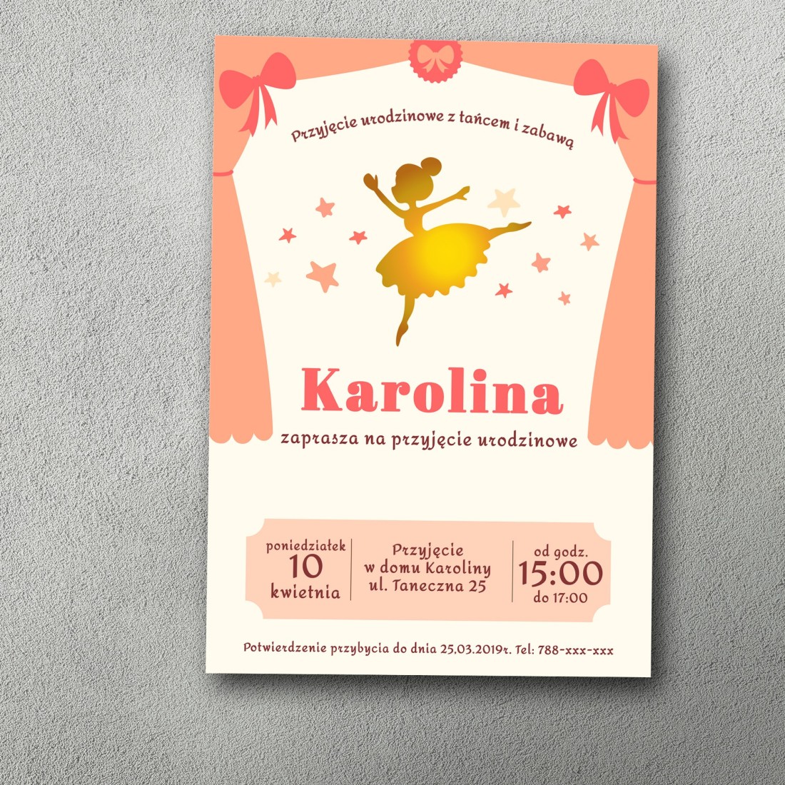 Motyw złotej tancerki wyłaniającej się na tle łososiowej ściany tworzy subtelny, artystyczny klimat – idealny na przyjęcie w stylu baletowym lub glamour. Kremowa scena w dolnej części projektu nadaje całości formę teatralnego przedstawienia, którego główną gwiazdą jest Twoja córka. Połączenie łososiowych i kremowych tonów z błyszczącą złotą grafiką daje wyjątkowy efekt wizualny – delikatny, ale przyciągający uwagę. Całość prezentuje się bardzo estetycznie i stylowo, pasując zarówno do przyjęć domowych, jak i tych organizowanych w salach baletowych czy restauracjach.