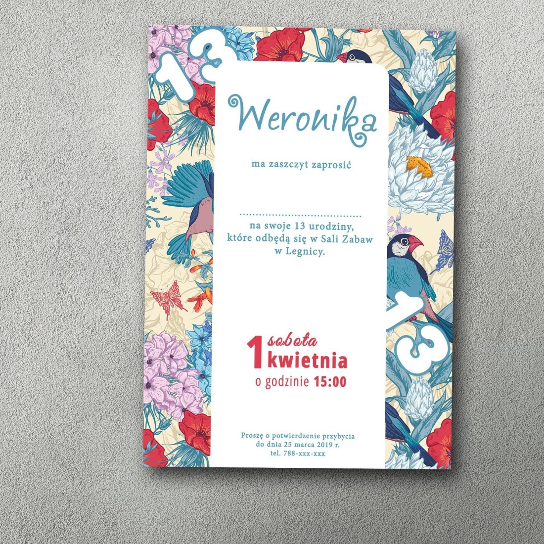 Zaproszenie urodzinowe dla dzieci w kwiatowo-ptasiej kompozycji dla wrażliwej duszy