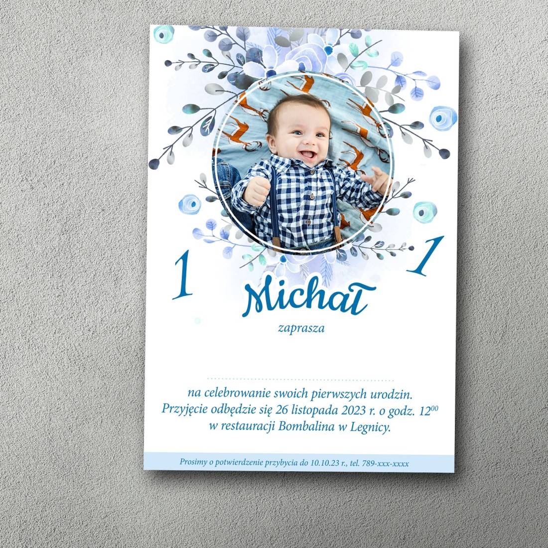 Blue Boy to propozycja dla rodziców, którzy chcą zaprosić najbliższych na pierwsze urodziny synka w naprawdę wyjątkowy sposób. Centralnym punktem zaproszenia jest zdjęcie dziecka – wkomponowane w delikatną, okrągłą ramkę, która nadaje całości elegancji i osobistego charakteru. Wokół zdjęcia znajduje się starannie ułożony bukiet niebieskich kwiatów – subtelny, ale dekoracyjny. Dzięki chłodnej, spokojnej palecie barw i miękkim kształtom, zaproszenie prezentuje się delikatnie, elegancko i bardzo dziecięco. Projekt jest idealny na kameralne, rodzinne przyjęcia z okazji roczku – w domu, w restauracji czy w ogrodzie. Zdjęcie dziecka sprawia, że zaproszenie staje się nie tylko informacją, ale też piękną pamiątką, którą wielu gości zachowa na długo.