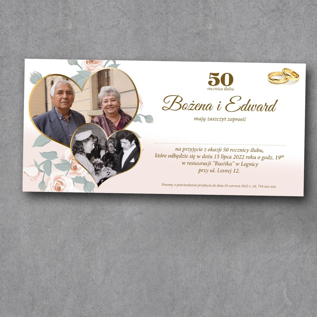 Eleganckie zaproszenie na rocznicę ślubu, zaprojektowane z myślą o wyjątkowej oprawie jubileuszu. Wykonane w podłużnym formacie, łączy klasyczną estetykę z możliwością pełnej personalizacji.