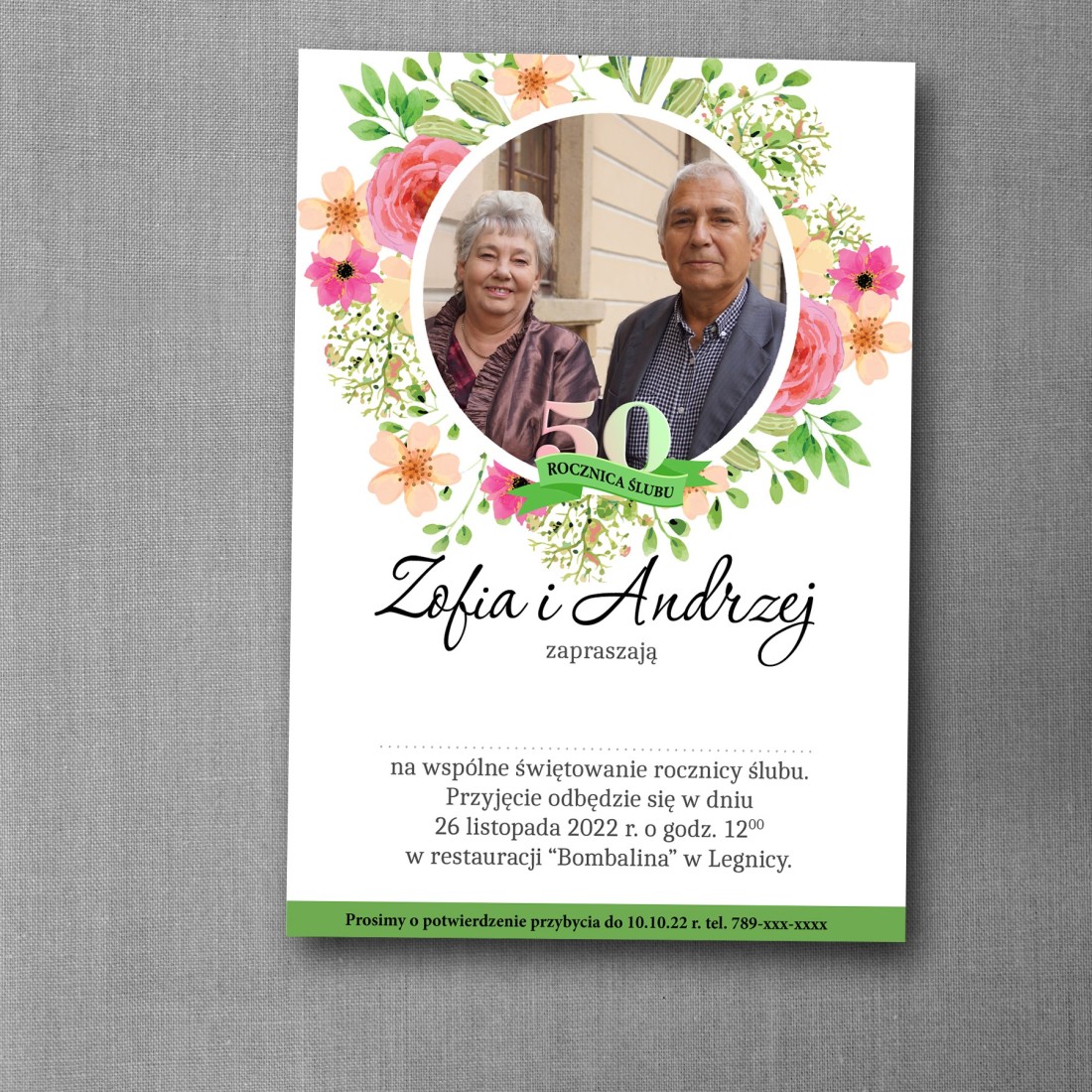 Zaproszenie na rocznicę ślubu – z miejscem na zdjęcie Jubilatów "Wiosenny Bukiet"