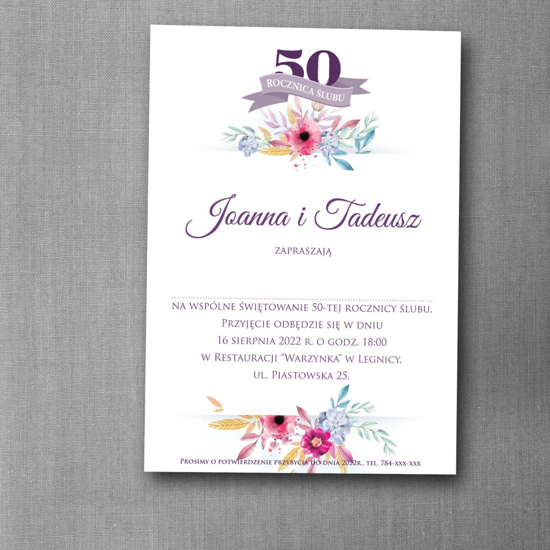 Zaproszenie na rocznicę ślubu – z miejscem na zdjęcie Jubilatów "Purpurowy Świt"
