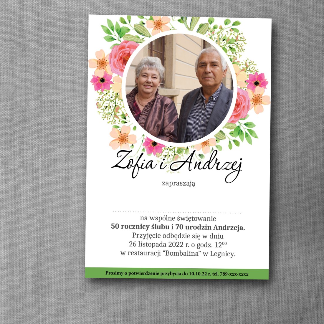 Eleganckie zaproszenie na urodziny i rocznicę w jednym dniu, stworzone z myślą o wyjątkowych, rodzinnych uroczystościach. Projekt utrzymany jest w jasnej, naturalnej kolorystyce z motywem wiosennych kwiatów, które nadają całości świeżości i ciepłego, celebracyjnego charakteru. Centralnym elementem jest zdjęcie, otoczone delikatnymi florystycznymi akcentami.