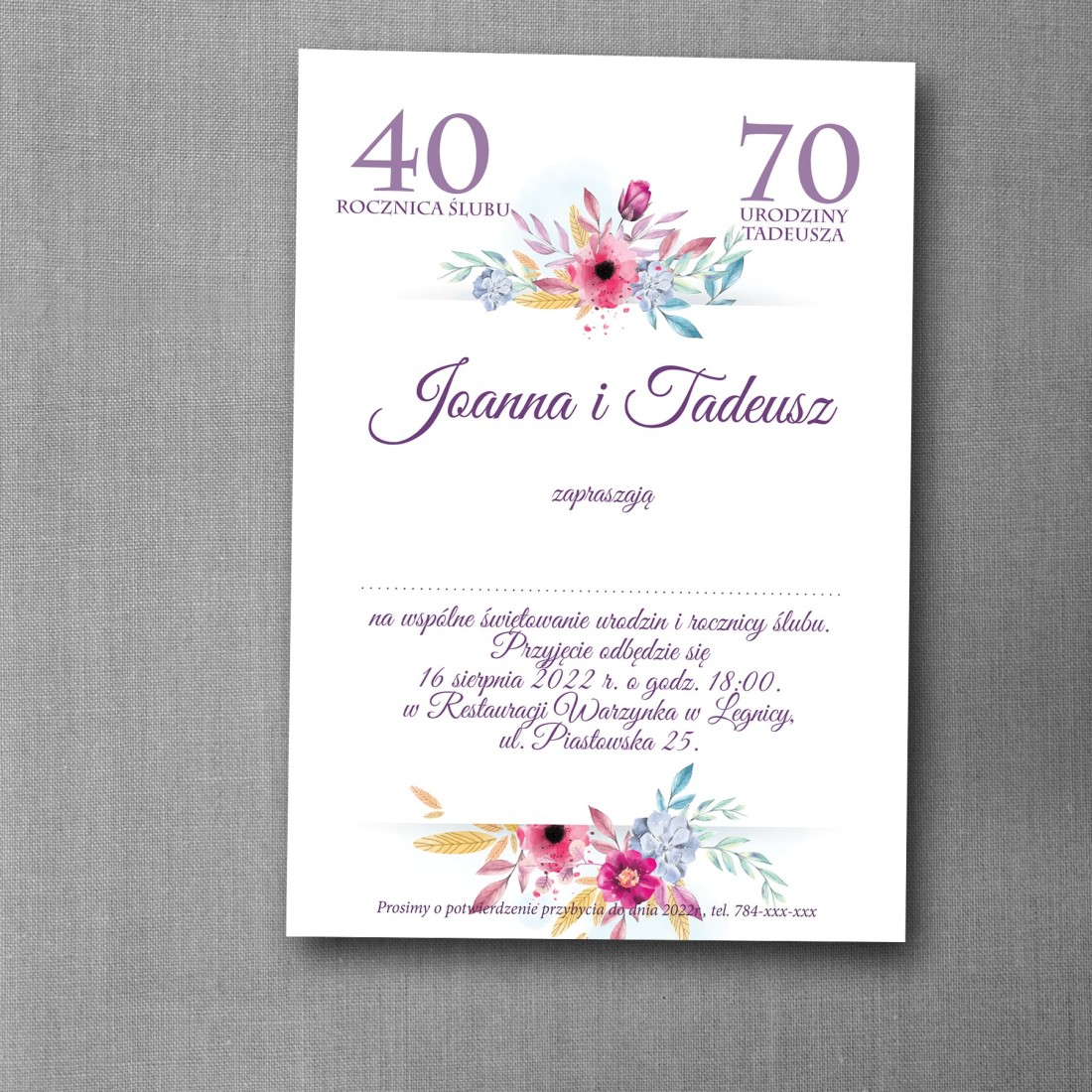 Eleganckie zaproszenie na urodziny i rocznicę ślubu w jednym dniu, stworzone z myślą o wspólnym świętowaniu ważnych jubileuszy rodzinnych. Projekt utrzymany jest w jasnej kolorystyce z wyrazistymi, purpurowymi kwiatami, które nadają całości elegancji i odświętnego charakteru.