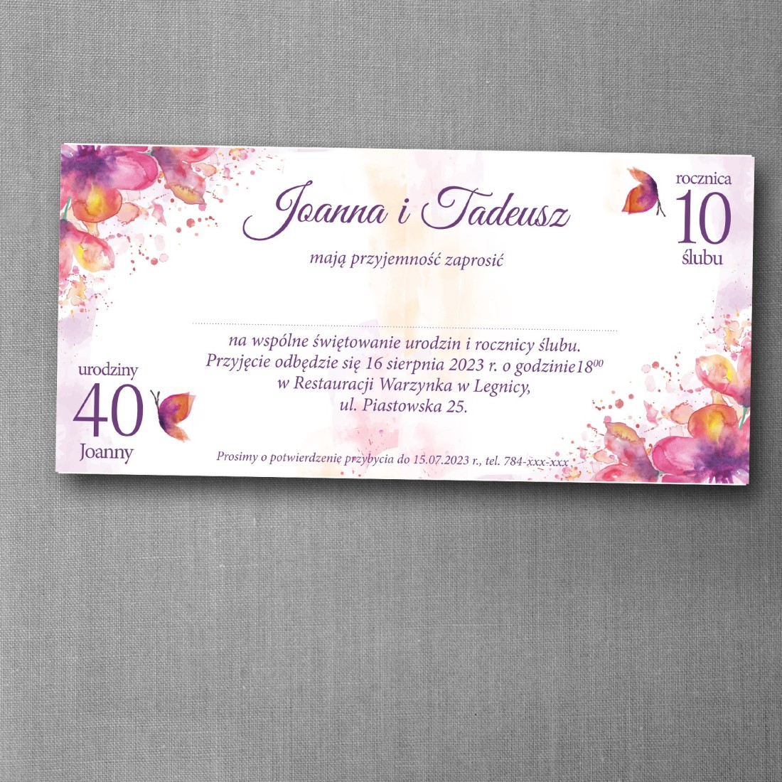 Zaproszenie pozwala w czytelny sposób zaprezentować informacje dotyczące urodzin męża, żony lub partnera oraz rocznicy ślubu bądź związku partnerskiego. Układ DL sprawia, że treść jest przejrzysta i elegancka, a całość doskonale sprawdzi się na uroczystości organizowane w gronie rodziny i bliskich.