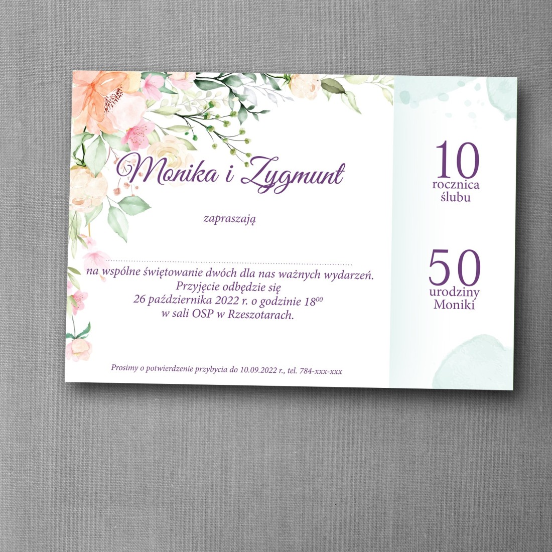 Zaproszenie umożliwia estetyczne połączenie urodzin jednej osoby z rocznicą ślubu lub związku partnerskiego. Czytelny układ oraz lekka typografia sprawiają, że wszystkie informacje są łatwe do odczytania, a całość prezentuje się subtelnie i nowocześnie.