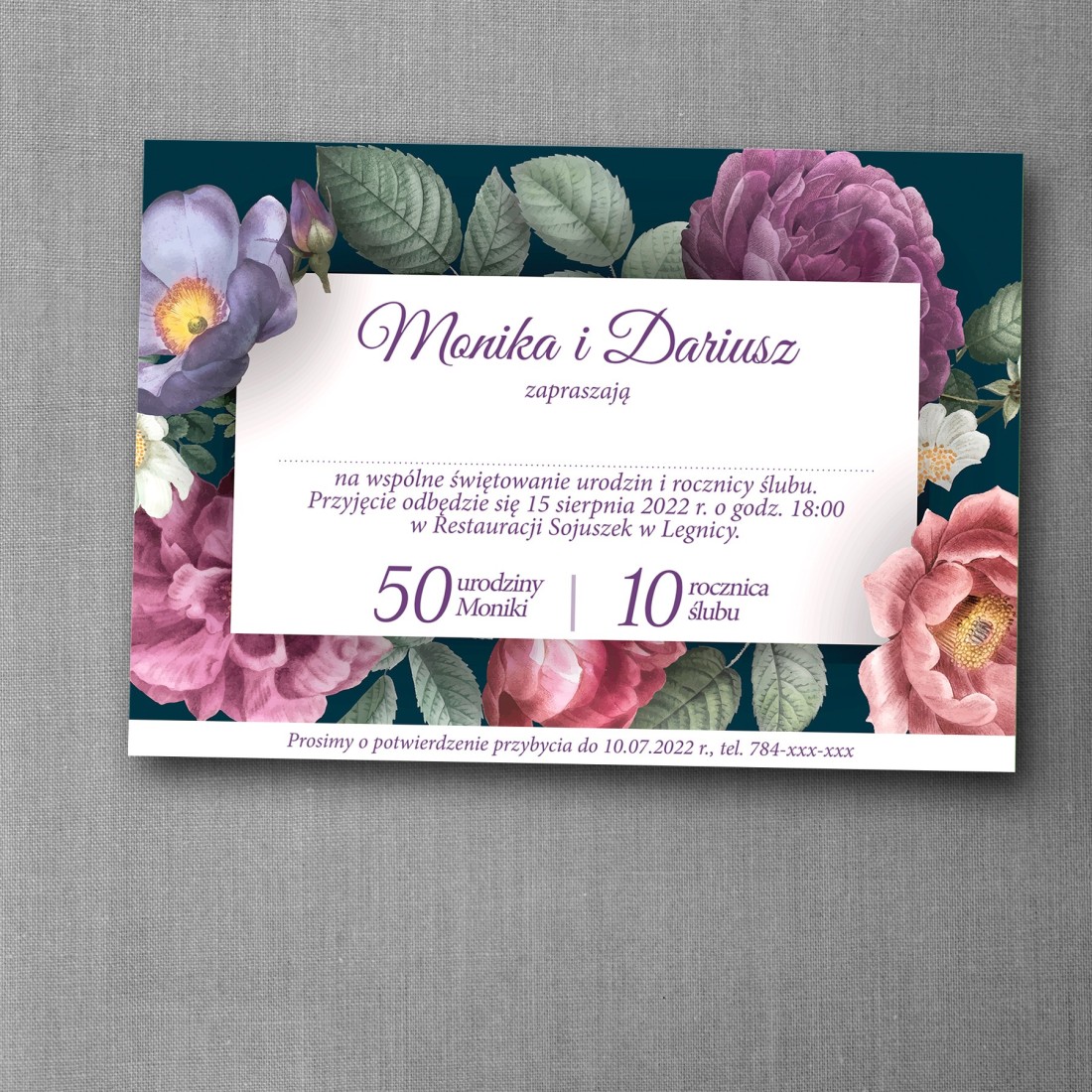 Wyraziste zaproszenie na urodziny i rocznicę ślubu w jednym zaproszeniu, zaprojektowane w głębokiej, nasyconej kolorystyce z motywem kwiatowego bukietu na ciemnym tle. Projekt przyciąga uwagę elegancją i doskonale podkreśla wyjątkowy charakter jubileuszu.