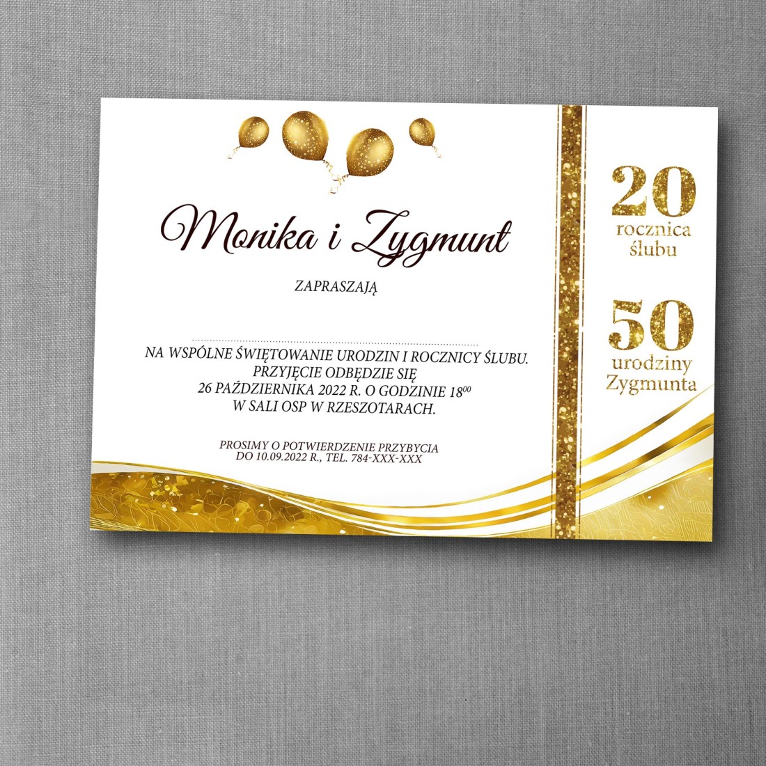Ekskluzywne zaproszenie na urodziny i rocznicę ślubu w jednym dniu, zaprojektowane z myślą o wyjątkowych jubileuszach, takich jak Złote Gody lub inne okrągłe rocznice. Projekt utrzymany jest w eleganckiej biało-złotej kolorystyce z dekoracyjnymi, złotymi pasami, subtelnym połyskiem oraz klasyczną typografią, która podkreśla rangę uroczystości.