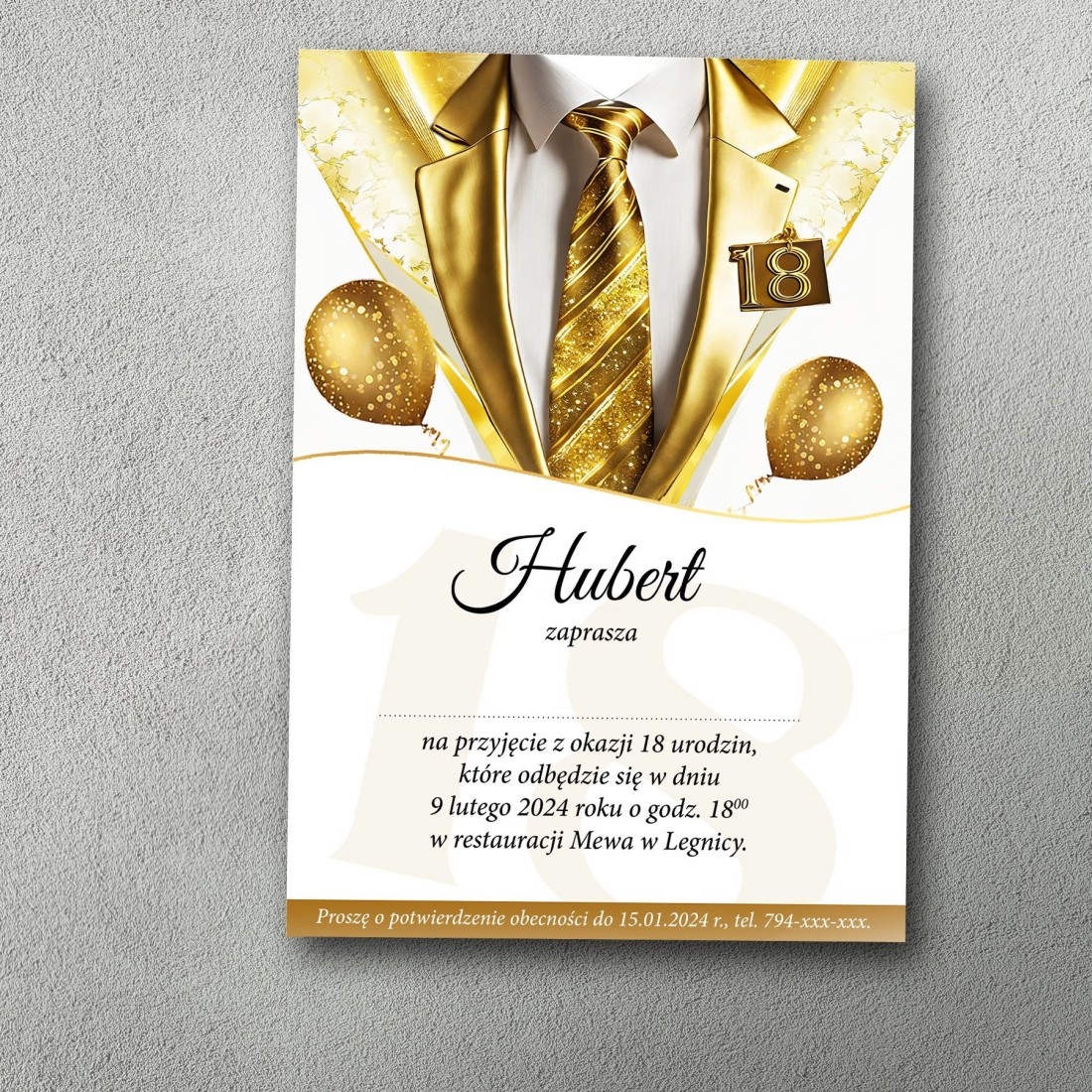 Zaproszenie na 18-tkę – złoty garnitur i balony