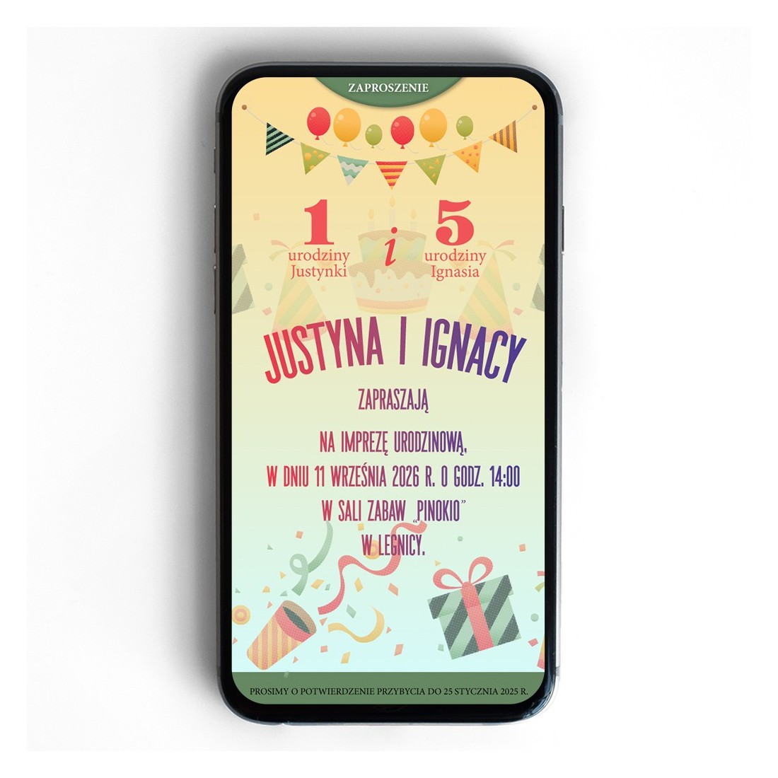 Wesołe zaproszenie elektroniczne z konfetti i prezentem dla dwóch solenizantów.