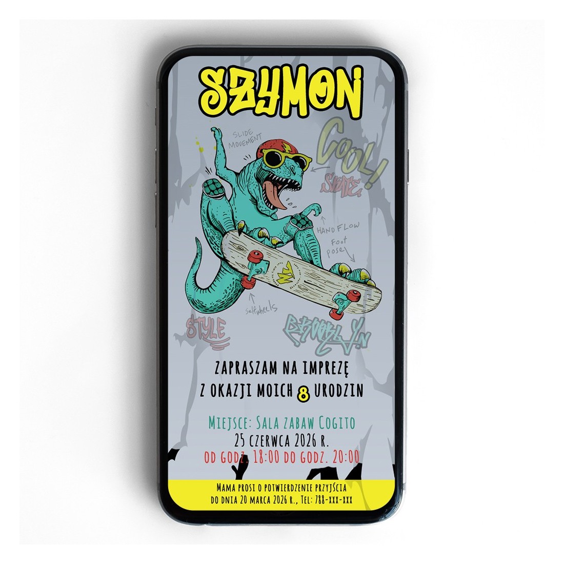 Dziecięce zaproszenie elektroniczne z motywem smoka na deskorolce. Idealne dla młodego fana deski, grafitowe napisy, kolorowa grafika.