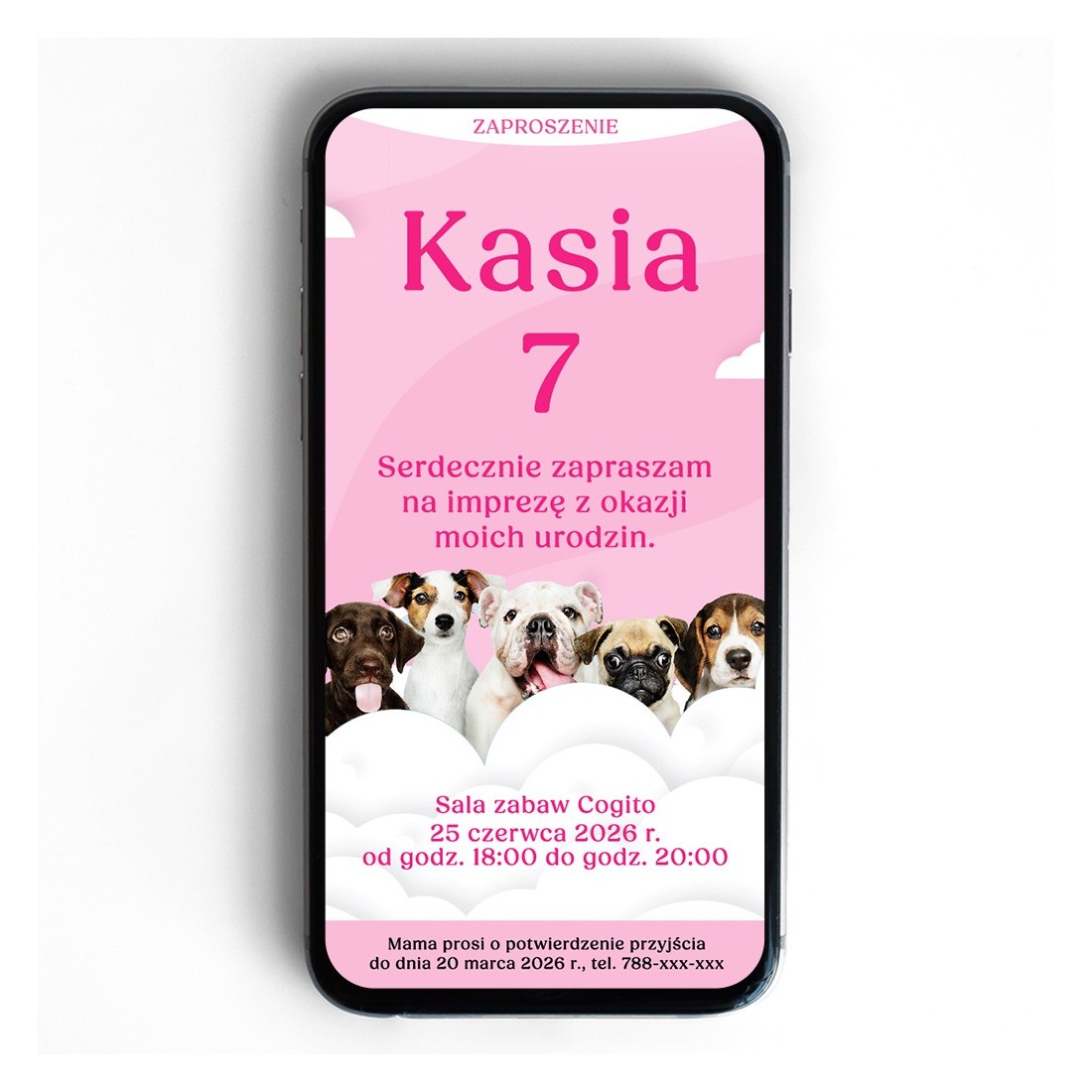 Różowe zaproszenie elektroniczne z uroczymi szczeniakami.
