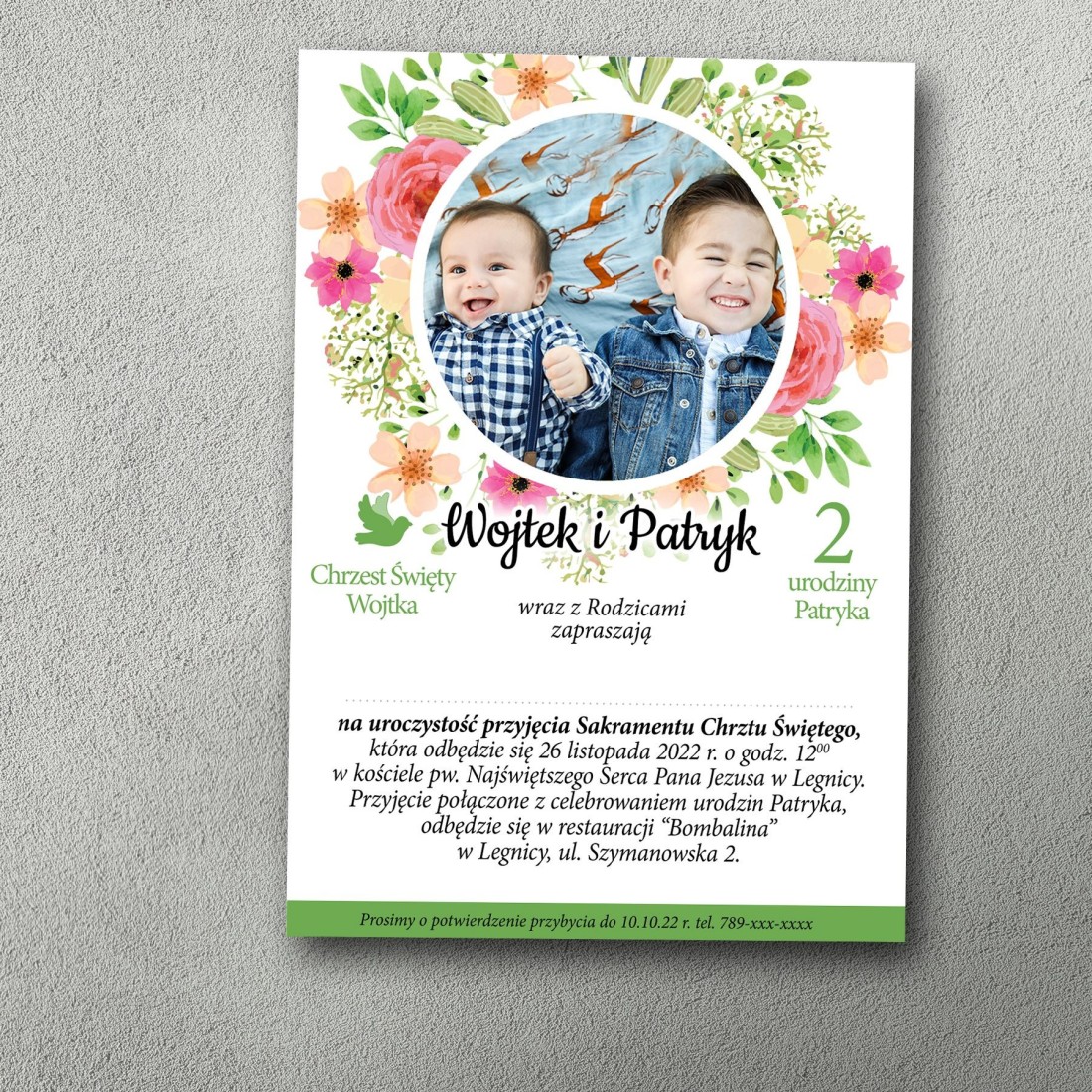 Radosne zaproszenie na chrzest i urodziny w jednym projekcie, inspirowane wiosenną naturą i jasną, świeżą kolorystyką. Kwiatowe ilustracje, delikatne liście i harmonijny układ nadają całości lekkości i rodzinnego charakteru.