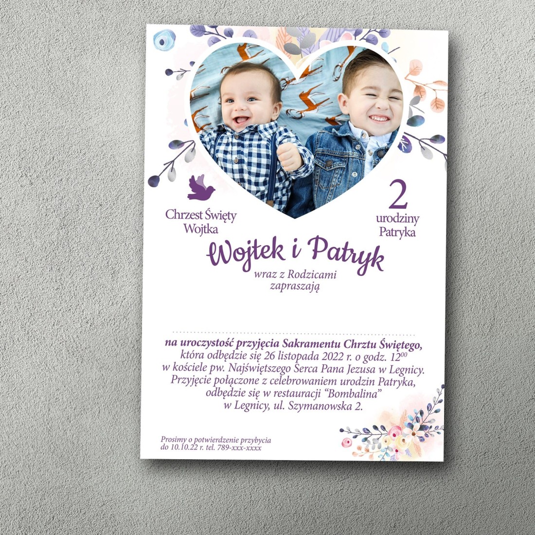 Stylowe zaproszenie na chrzest i urodziny utrzymane w subtelnej fioletowej kolorystyce z delikatnymi, kwiatowymi akcentami. Projekt łączy elegancję z lekkością, tworząc estetyczny i czytelny układ treści.