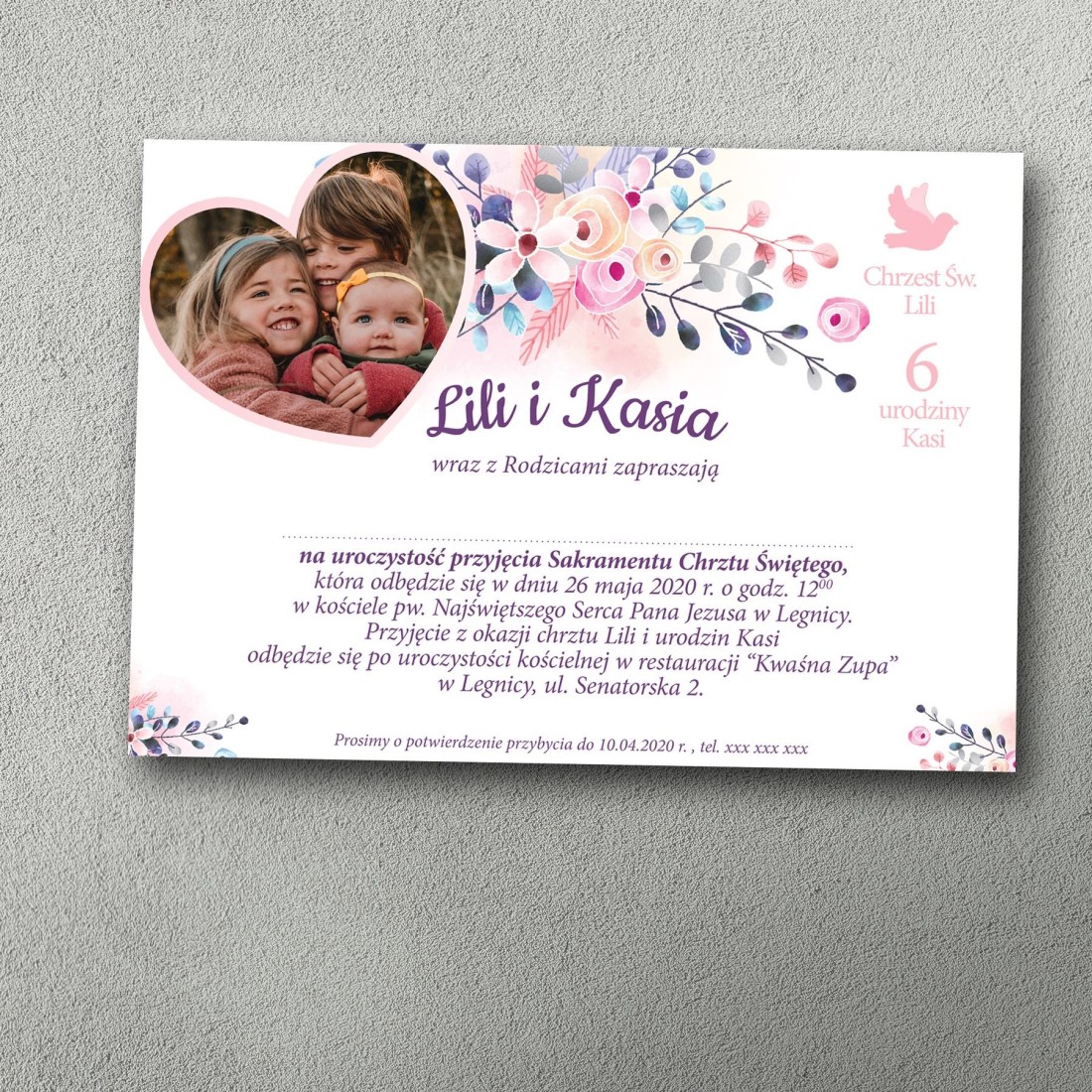 Romantyczne zaproszenie na chrzest i urodziny w jednym dniu, utrzymane w jasnej, różowej kolorystyce z motywem kwiatów i serca. Delikatne ilustracje oraz harmonijny układ tworzą ciepły i rodzinny klimat.