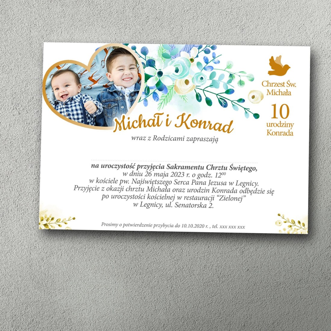 Na zaproszeniu przewidziano miejsce na zdjęcie, imiona oraz czytelnie rozdzielone informacje dotyczące chrztu i urodzin dowolnego członka rodziny. Harmonijny układ oraz klasyczna typografia sprawiają, że zaproszenie doskonale sprawdzi się zarówno na uroczystości dziecięce, jak i jubileusze dorosłych.
