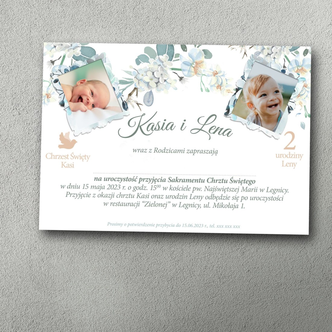 Na grafice znajduje się miejsce na zdjęcie dziecka, imiona oraz czytelnie wydzielone informacje dotyczące chrztu i urodzin wybranego członka rodziny. Harmonijny układ oraz klasyczna typografia sprawiają, że zaproszenie sprawdzi się zarówno przy uroczystościach z udziałem dzieci, jak i dorosłych. To idealny wybór dla osób szukających estetycznego zaproszenia na podwójną okazję rodzinną.