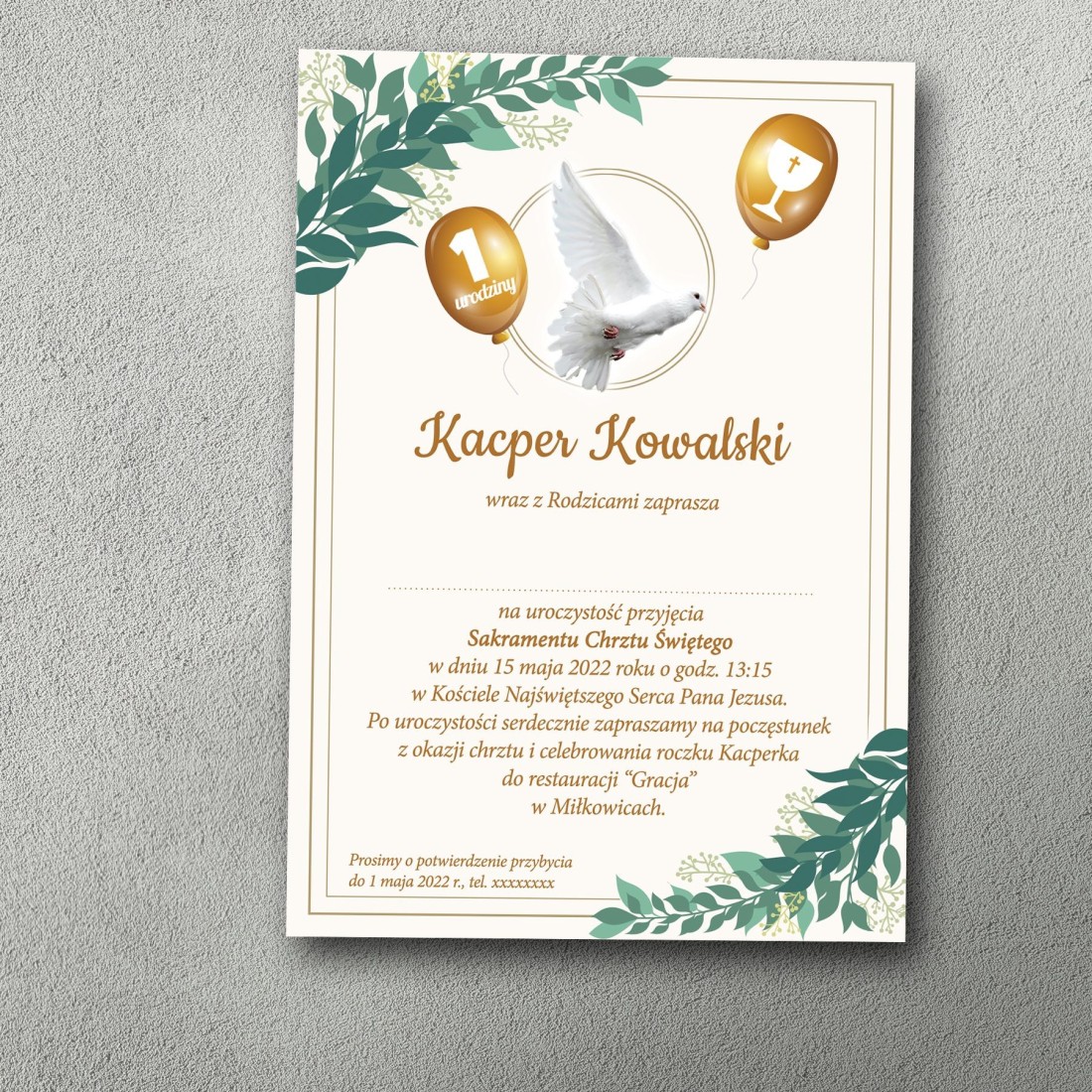 Zaproszenie zawiera miejsce na imię dziecka, datę chrztu oraz informację o pierwszych urodzinach. Harmonijny układ sprawia, że całość jest czytelna i estetyczna. To doskonały wybór dla rodziców szukających subtelnego zaproszenia na chrzest i roczek w jednym dniu.