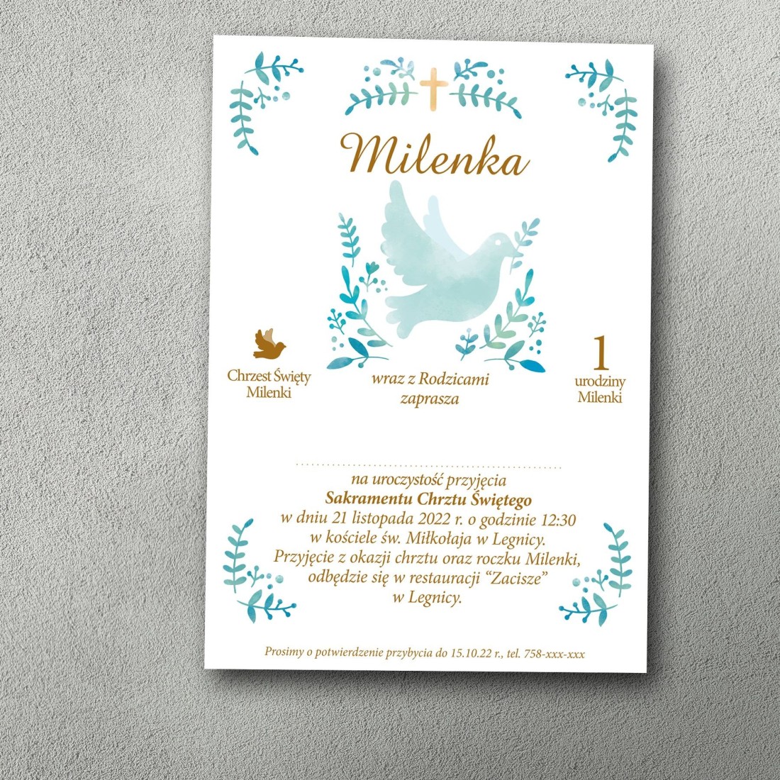 Subtelne zaproszenie na chrzest i roczek w jednym dniu, zaprojektowane z myślą o spokojnej, rodzinnej uroczystości. Projekt utrzymany jest w jasnej, błękitno-białej kolorystyce z motywem gołąbka, który symbolizuje chrzest i duchowy charakter wydarzenia. Delikatne roślinne akcenty oraz klasyczna typografia nadają zaproszeniu elegancki i ponadczasowy wygląd.