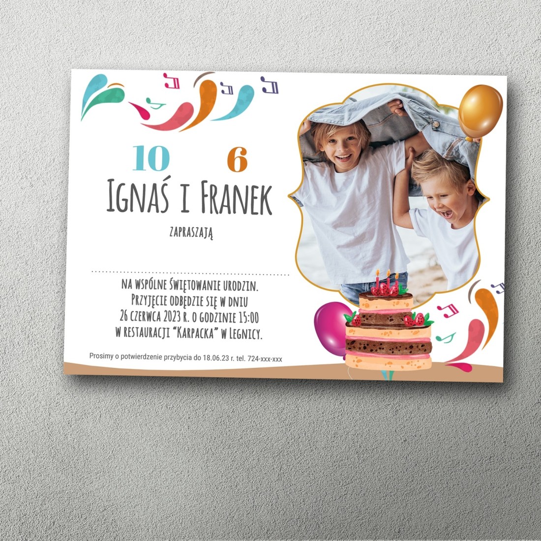 To personalizowane zaproszenie urodzinowe z dwoma zdjęciami, zaprojektowane w energetycznej, kolorowej stylistyce. Motyw fal i żywe barwy nadają projektowi ruchu i radości. Elementy graficzne prowadzą wzrok do zdjęć oraz treści, tworząc spójną i czytelną kompozycję.