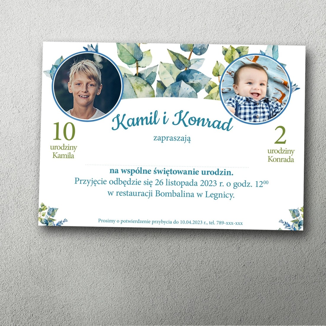 To personalizowane zaproszenie na podwójne urodziny ze zdjęciem, zaprojektowane w naturalnym, leśnym stylu. Grafika opiera się na motywie zielonych liści i roślinnych ilustracji, które tworzą lekką, harmonijną ramę wokół treści zaproszenia. Dwa okrągłe miejsca na zdjęcia są wyraźnie wyeksponowane i subtelnie połączone z kompozycją graficzną.
