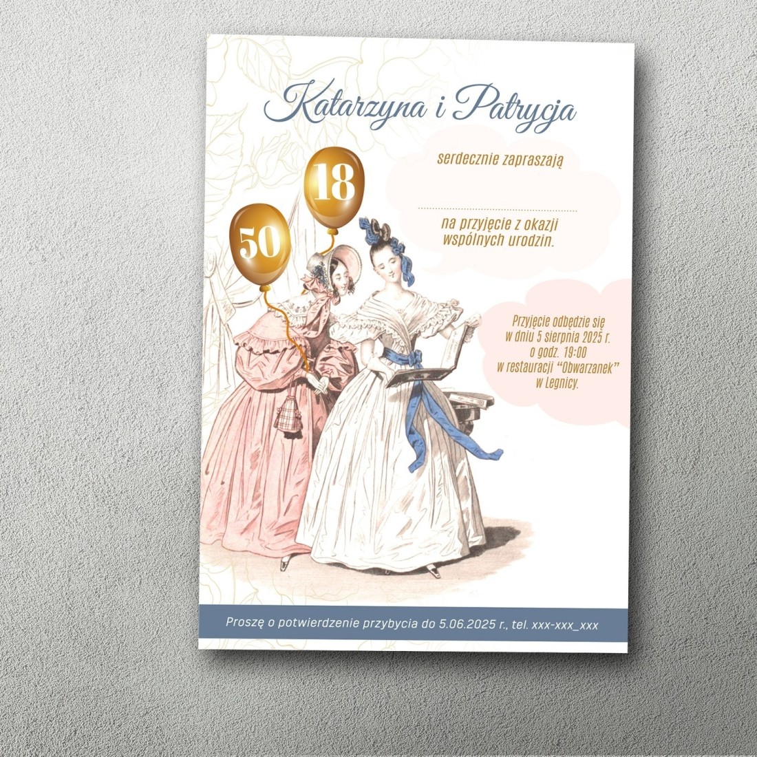 To personalizowane zaproszenie na podwójne urodziny dorosłych, wyróżniające się ilustracyjną grafiką inspirowaną klasycznym stylem. Centralnym motywem są eleganckie postacie w strojach nawiązujących do dawnych epok, przedstawione w delikatnej, artystycznej formie. Ilustracja buduje spokojny, uroczysty klimat i nadaje zaproszeniu wyjątkowego charakteru.