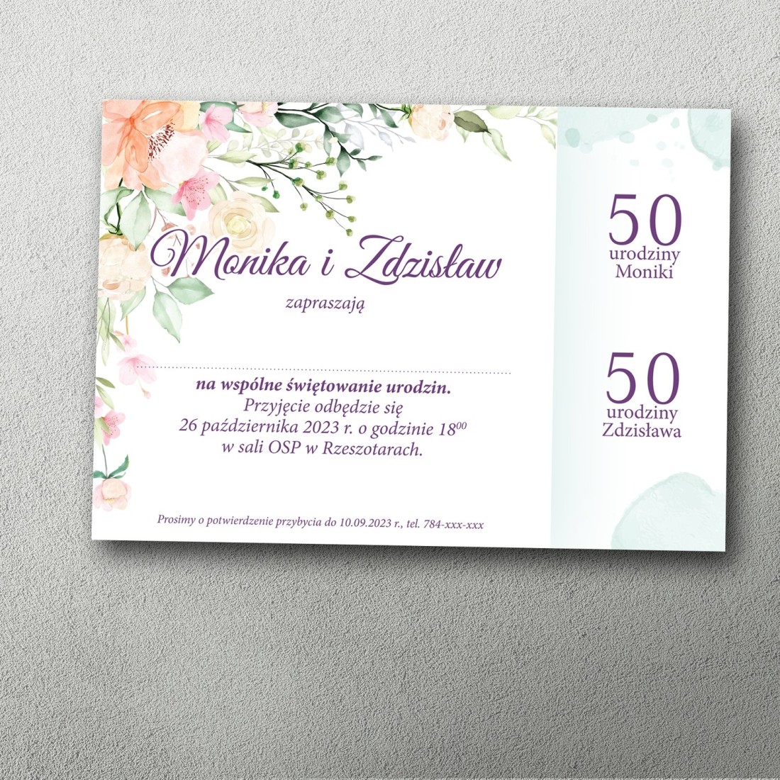 Pastelowe odcienie różu, beżu i zieleni sprawiają, że zaproszenie wygląda świeżo i ponadczasowo. Elementy kwiatowe zostały rozmieszczone z wyczuciem — nie przytłaczają treści, a jednocześnie przyciągają uwagę estetyką i detalem. Imiona jubilatów, wiek oraz informacje o przyjęciu są czytelne i dobrze widoczne.