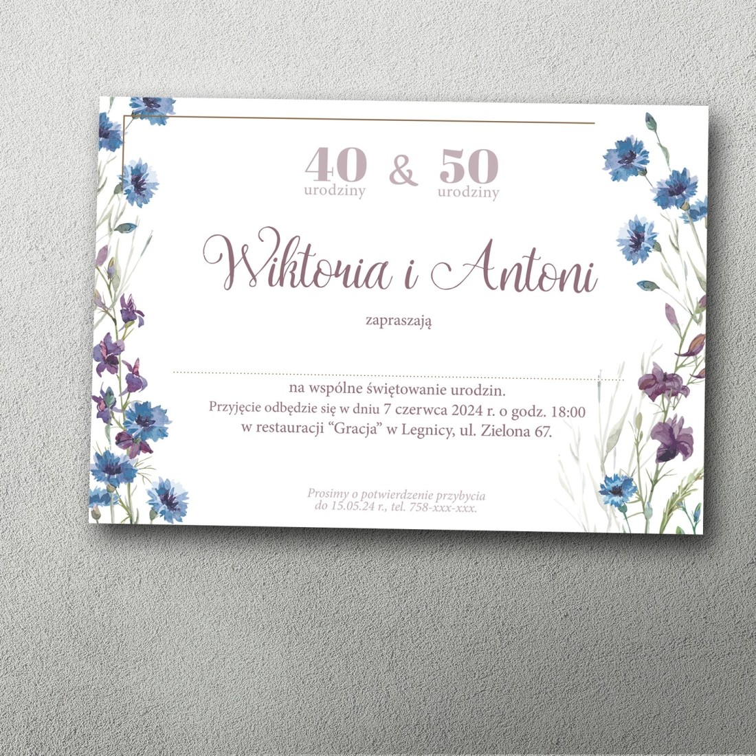 zaproszenie na podwójne urodziny chabry kwiatowe delikatna grafika