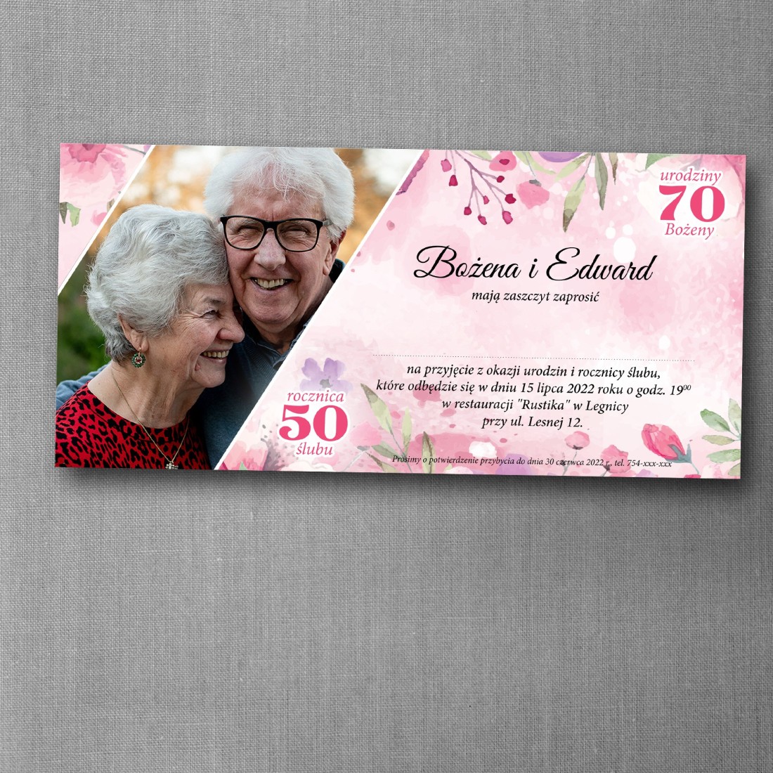 Projekt umożliwia umieszczenie zdjęcia – na przykład fotografii ze ślubu lub aktualnego zdjęcia jubilatów, co czyni zaproszenie wyjątkową pamiątką wspólnych lat. Zaproszenie 2 w 1 doskonale sprawdzi się na jubileusze małżeńskie połączone z urodzinami jednej z bliskich osób.