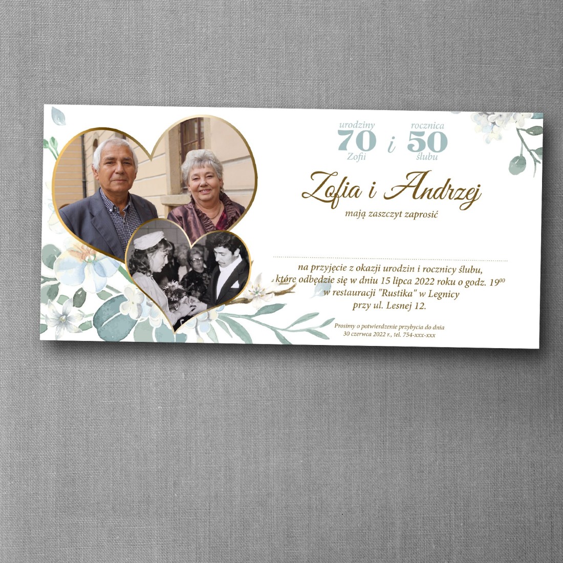Projekt umożliwia umieszczenie dwóch zdjęć – na przykład fotografii z dnia ślubu oraz aktualnego portretu jubilatów – co podkreśla symbolikę wspólnie przeżytych lat. Zaproszenie idealnie sprawdzi się na rodzinne jubileusze, podczas których świętowana jest zarówno rocznica związku, jak i urodziny jednej z bliskich osób.