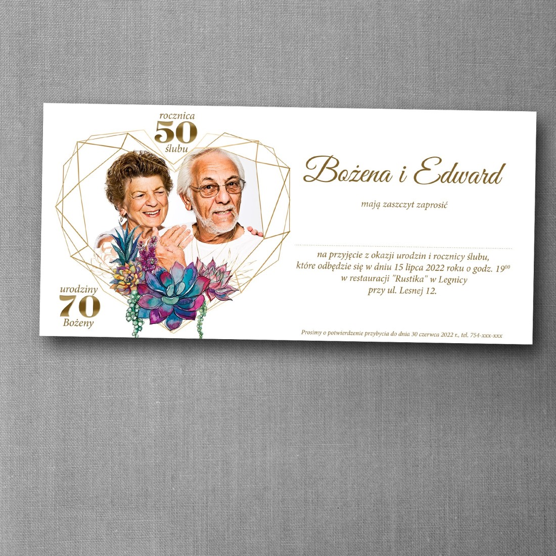 Możliwość dodania dwóch zdjęć pozwala stworzyć zaproszenie o osobistym charakterze, łączące wspomnienia z przeszłości z aktualnym etapem życia. To doskonały wybór na jubileusze rodzinne, rocznice ślubu i urodziny organizowane podczas jednego wydarzenia.