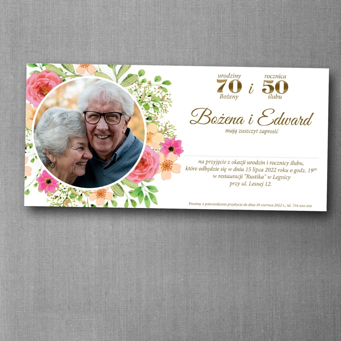 Stylowe zaproszenie na urodziny połączone z rocznicą ślubu, zaprojektowane w jasnej, eleganckiej stylistyce z wyrazistymi kwiatowymi akcentami. Projekt przyciąga uwagę subtelną kolorystyką i klasyczną typografią, idealną na rodzinne uroczystości jubileuszowe.