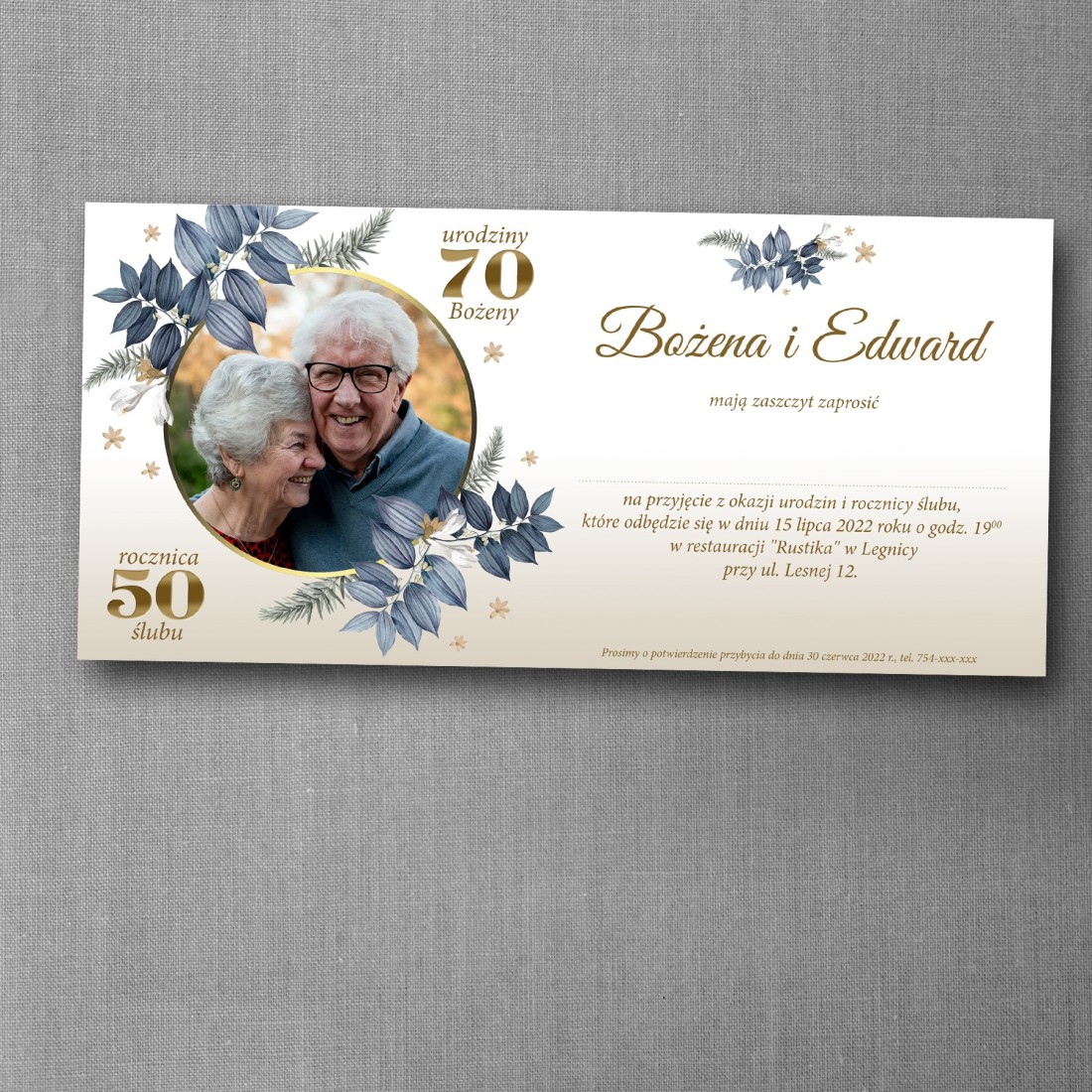 Zaproszenie w formacie DL umożliwia estetyczne zaprezentowanie treści oraz umieszczenie jednego zdjęcia, które może pochodzić zarówno z dawnych lat, jak i z obecnego etapu życia. To propozycja dla osób ceniących klasykę i stonowany styl.